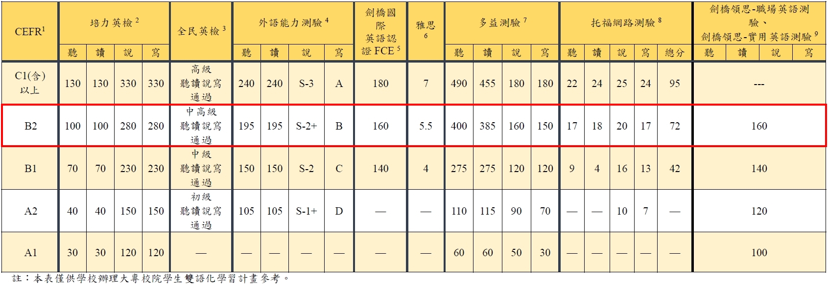 CEFR B2 合格分數對照表